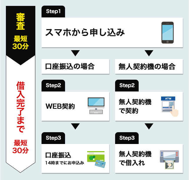 最短30分後審査結果→融資。平日14時までなら審査通過後そのまま口座へ入金OK。