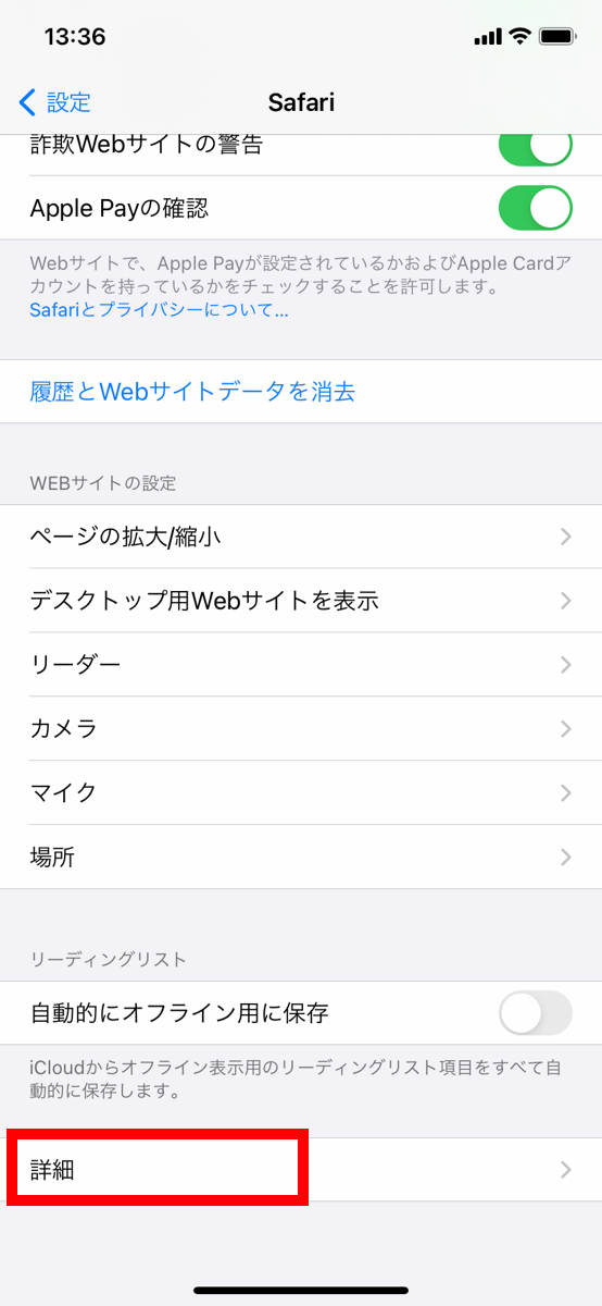 4、「Javascript」がオフ(=白色)になっている場合は、タップしてオンにします。