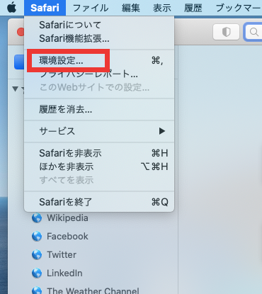 1、Safariを開き、メニューバーの環境設定を起動します。