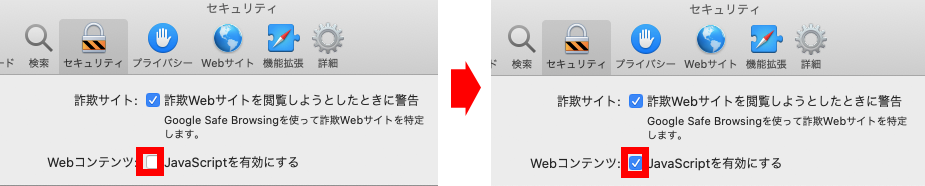 2、セキュリティの「Webコンテンツ:JavaScriptを有効にする」にチェックを入れます。